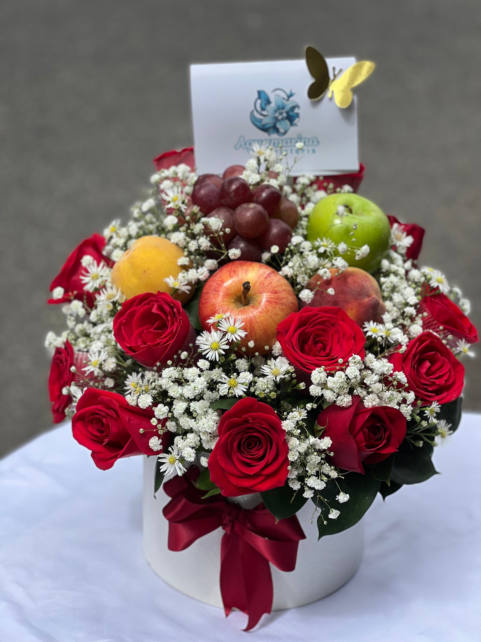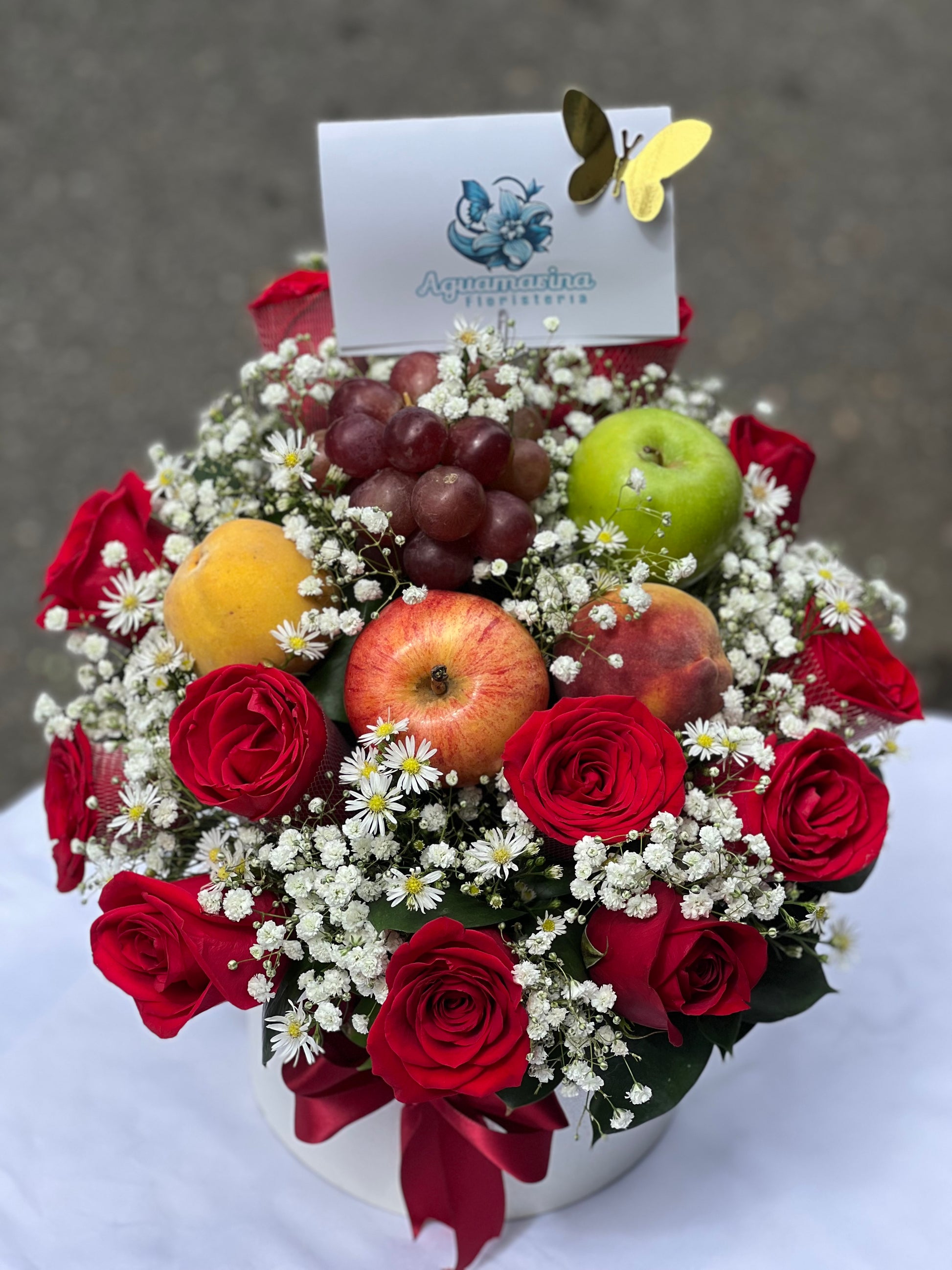 Sorprende con un detalle que combina belleza y frescura: un elegante arreglo de rosas rojas acompañadas de delicada gypsophila y verdes naturales, realzado con la frescura de frutas como manzanas, uvas y duraznos.