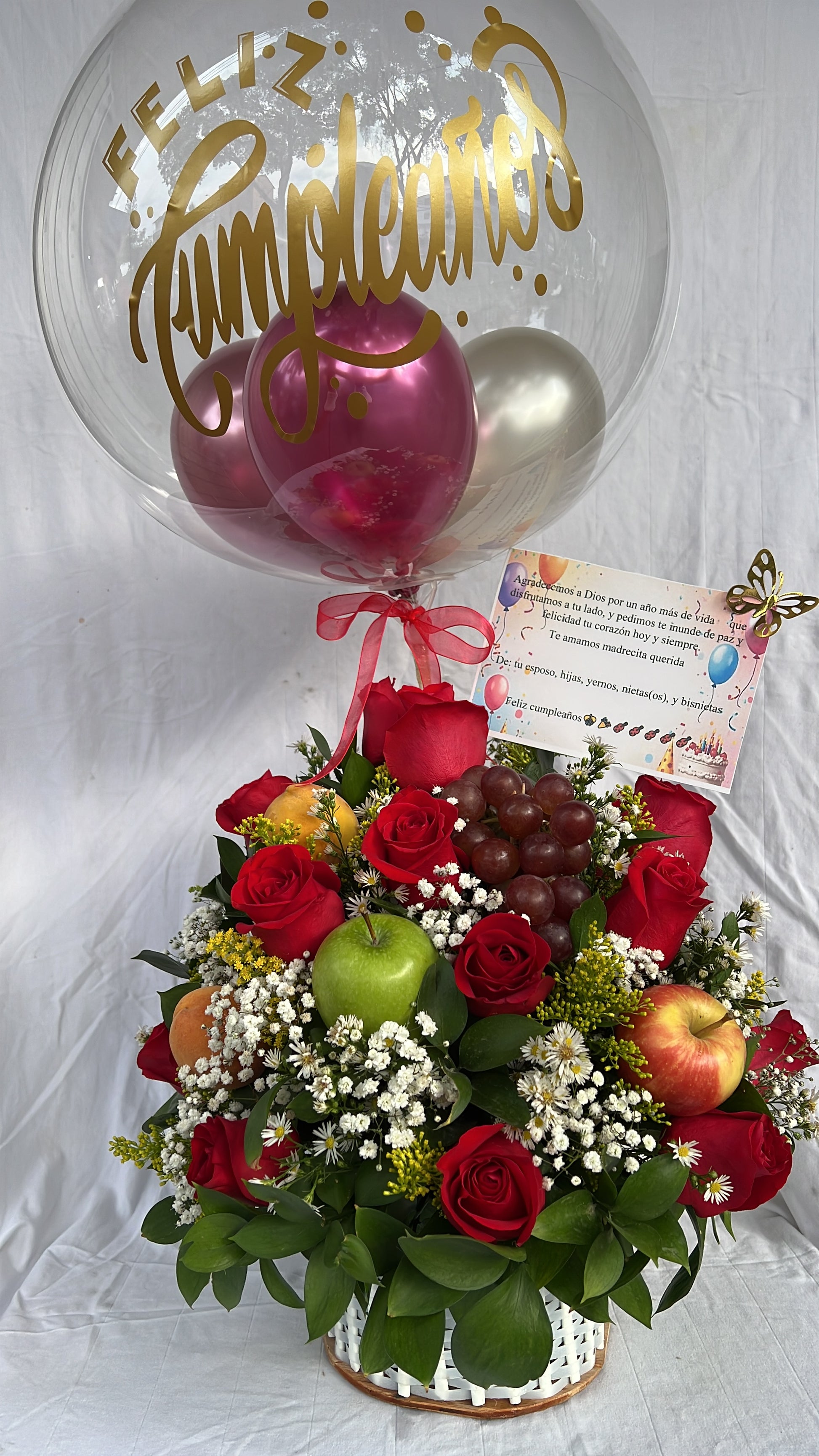 Celebra la vida con un detalle único y lleno de color. Nuestro arreglo Cumpleaños Especial incluye rosas rojas frescas, acompañadas de frutas naturales (manzanas, uvas, duraznos) y un globo burbuja personalizado con “Feliz Cumpleaños”.