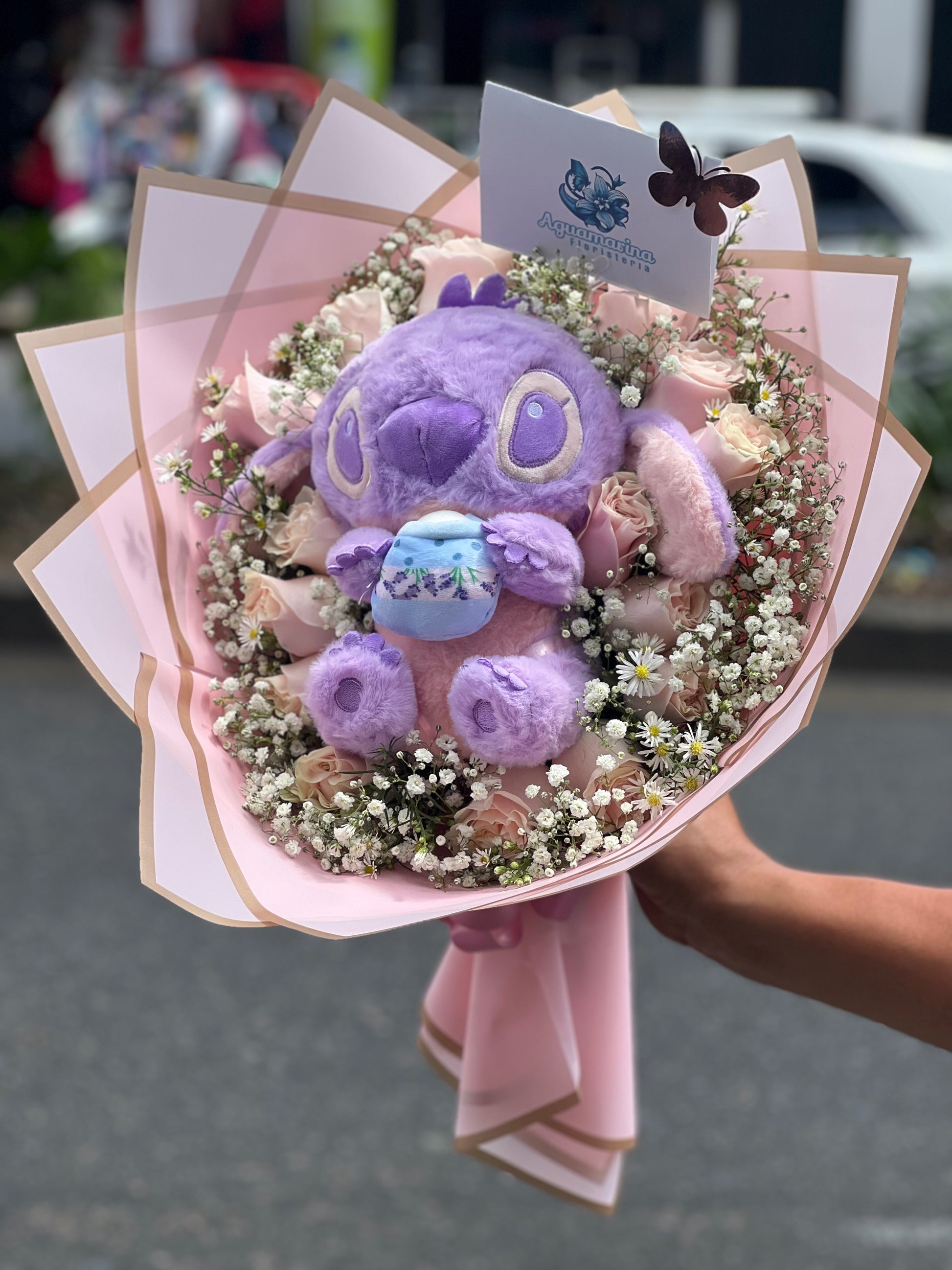 Arreglo floral con 15, rosas, rosadas,nube envuelta en papel coreano con Peluche a su gusto