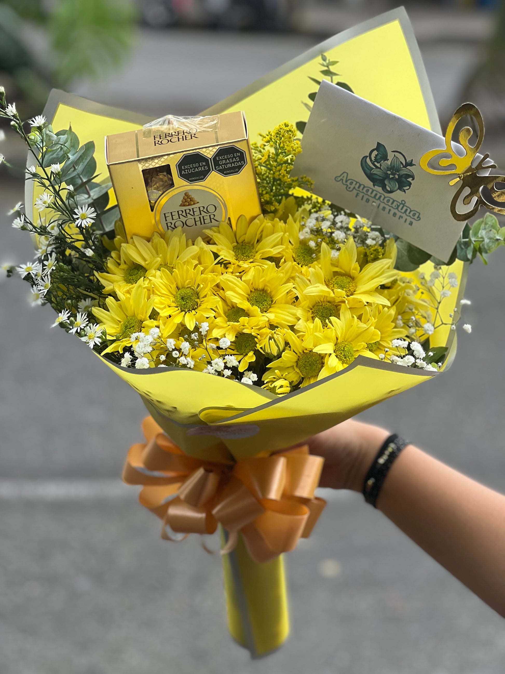 Un detalle que combina la frescura de las margaritas amarillas con la dulzura inconfundible de Ferrero Rocher. Perfecto para expresar gratitud, amistad o simplemente iluminar el día de alguien especial con un toque elegante y delicioso.