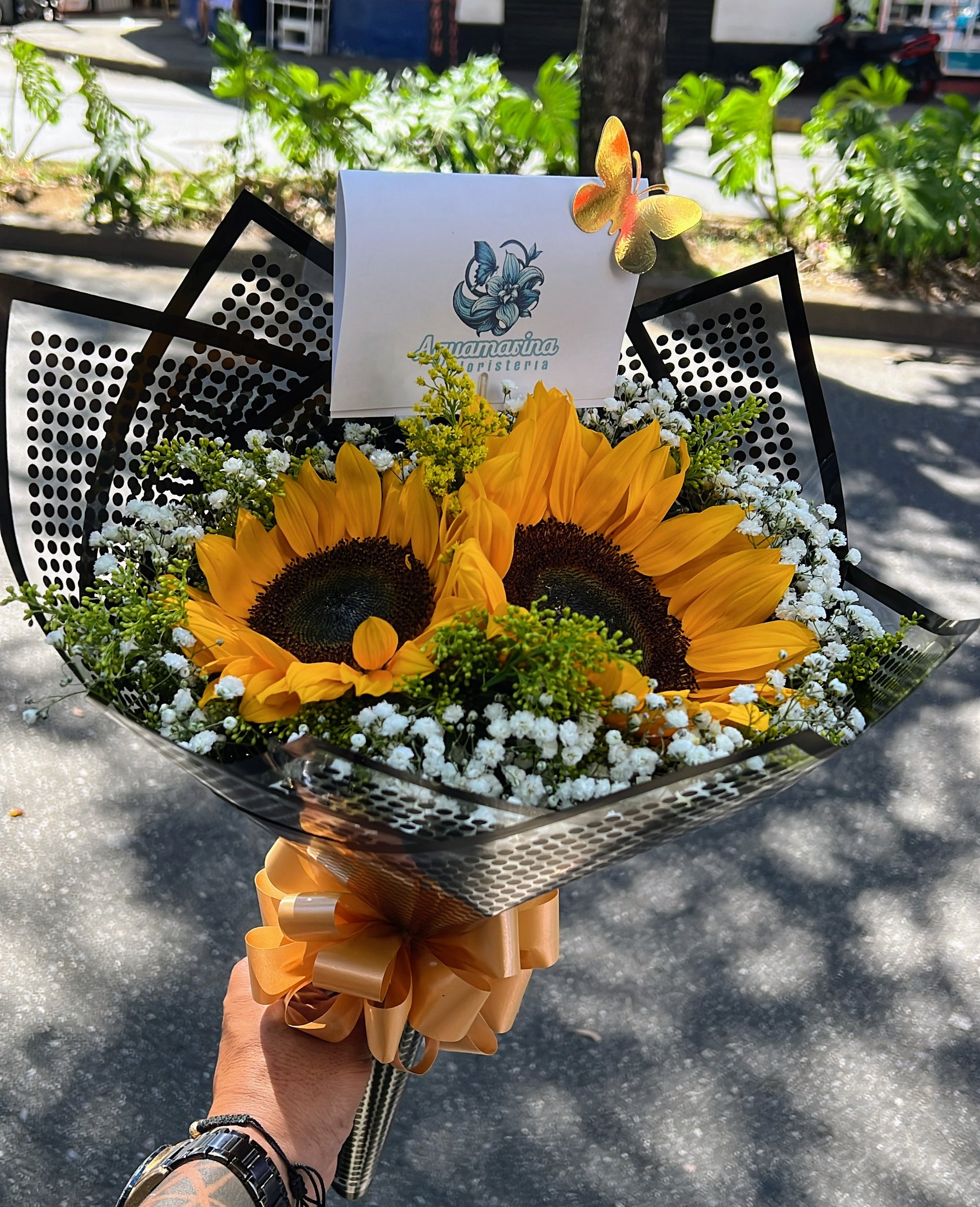Un detalle radiante con 2 girasoles premium, delicadamente acompañados de gypsophila y follaje, que simbolizan felicidad, energía y optimismo. 💛 Perfecto para alegrar el día de alguien especial con un gesto sencillo pero lleno de luz.