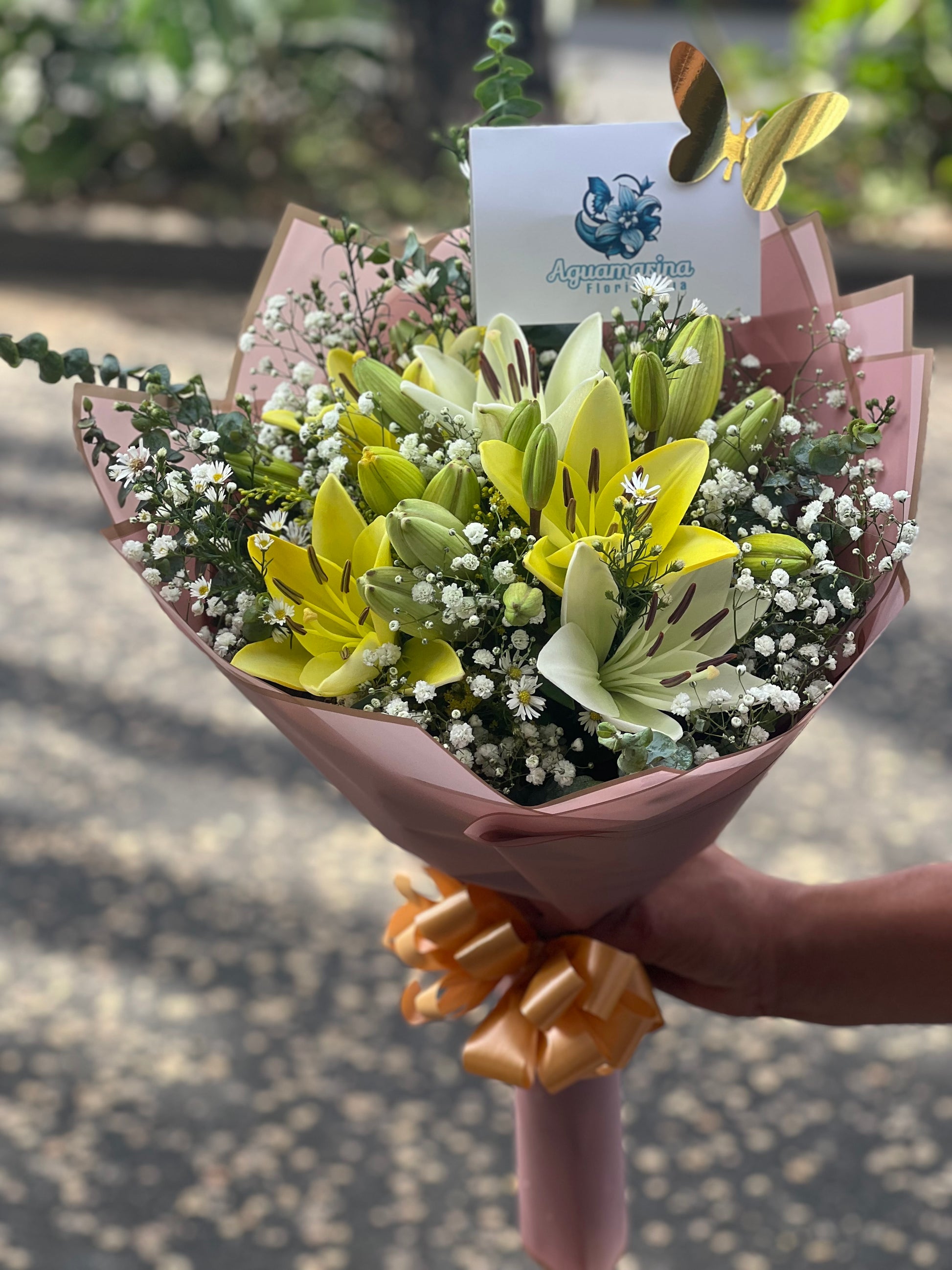 Un delicado ramo de lirios blancos y amarillos, acompañado de gypsophila, margaritas y follaje verde, envuelto en tonos cálidos que realzan su belleza. 🌿💛 Perfecto para expresar admiración, gratitud o buenos deseos en ocasiones especiAles
