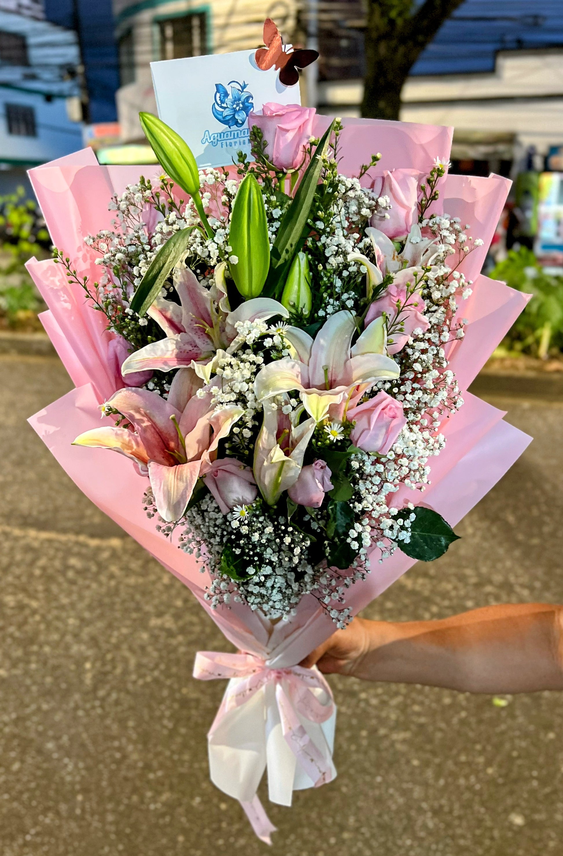 Un delicado bouquet en tonos rosados que combina lirios, rosas y gypsophila, envuelto en elegante papel rosa pastel y adornado con un lazo de cinta. Su diseño transmite ternura, amor y pureza, ideal para expresar cariño, admiración o dulces sentimientos.