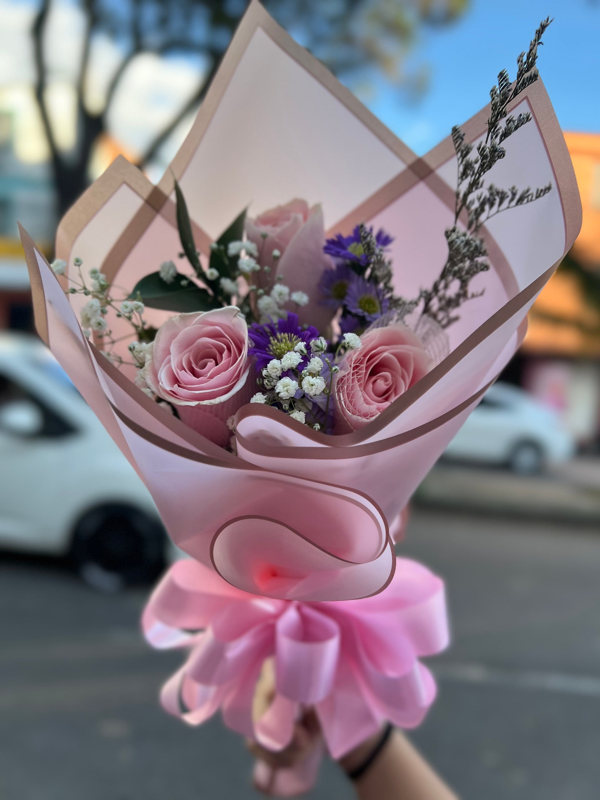 3, rosas del color que quieras Decorado con Follajes, envuelto en papel coreano