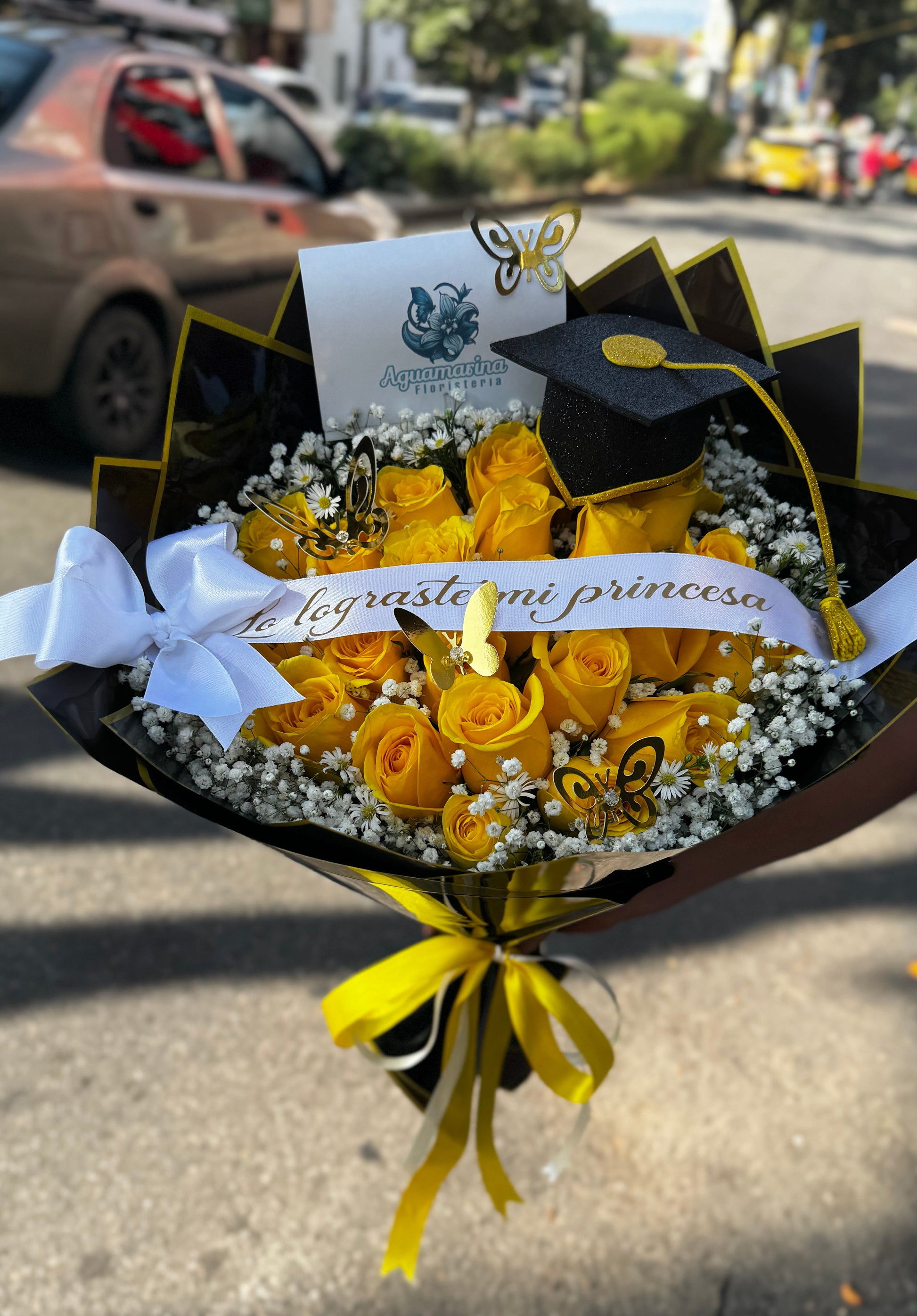 Hermoso, arreglo de 24 rosas, amarillas premium, acompañados de nube, cinta personalizada, Virrete y mariposas que hacen sentir a esa persona amada en un día tan importante su graduación📚🎓
