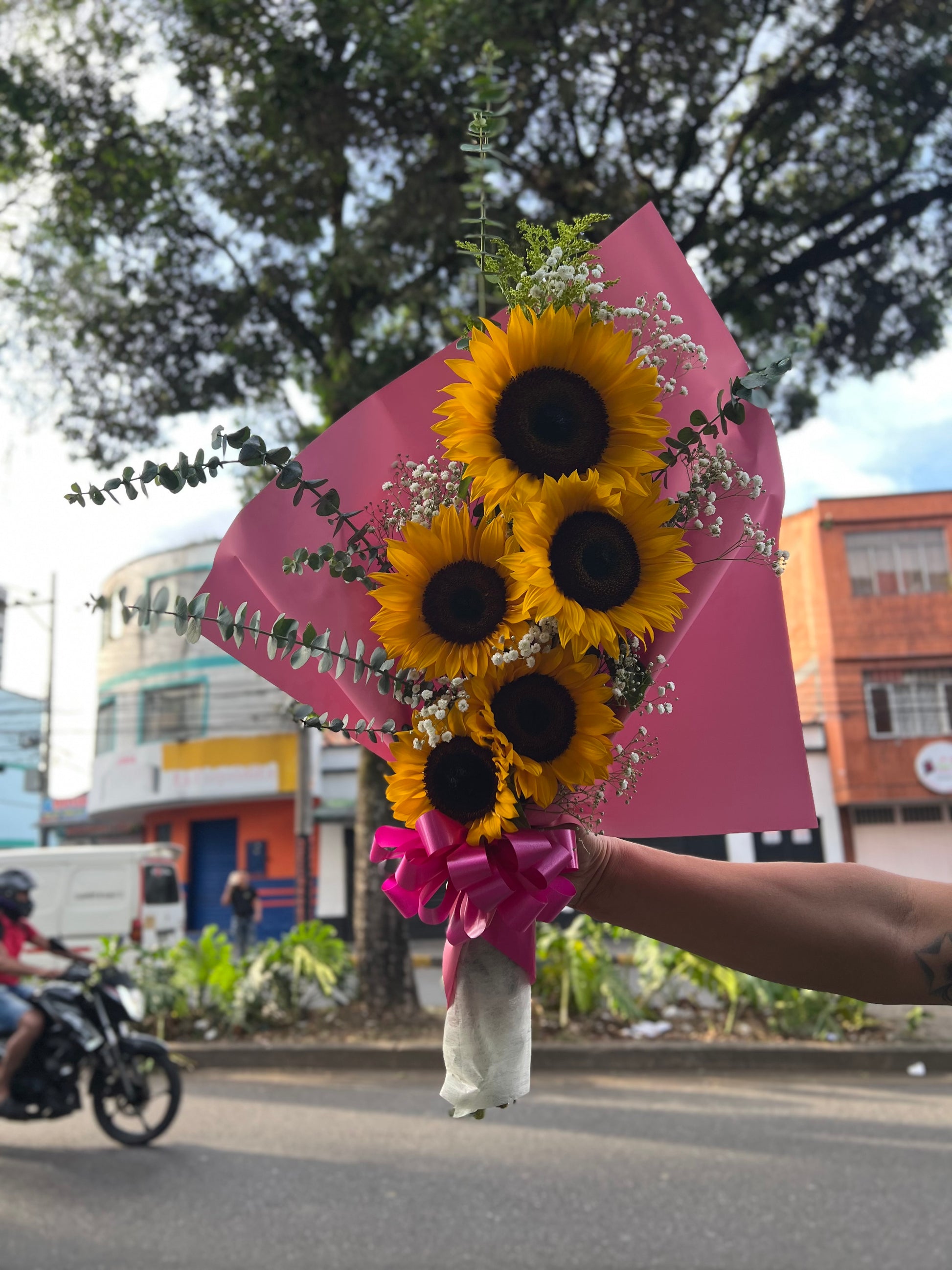Un espectacular ramo de 5 girasoles frescos, acompañados de gypsophila y follaje, envuelto en tonos delicados que resaltan su brillo natural. 🌻 Perfecto para transmitir energía, optimismo y felicidad en cualquier ocasión especial.