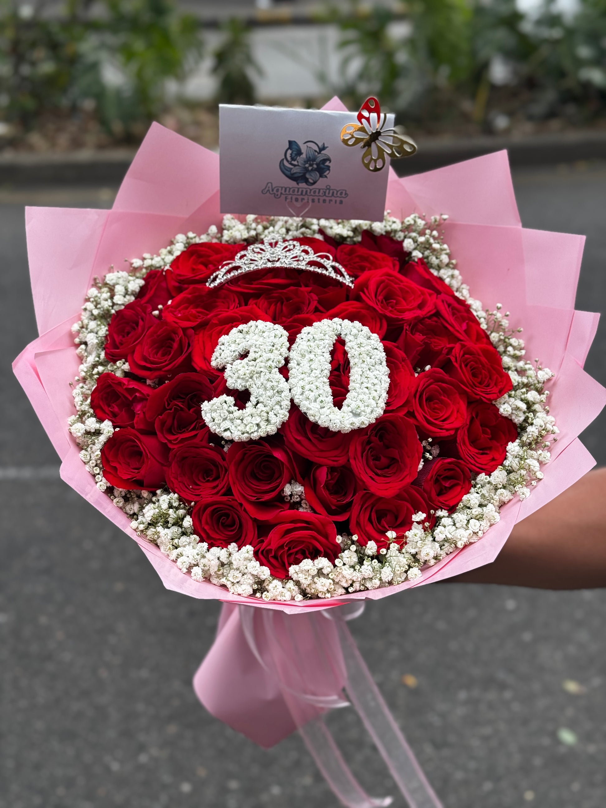 Un majestuoso bouquet de rosas rojas coronado con delicadas flores blancas formando el número 30 tú escoges el número y un toque de elegancia con tiara. Diseño premium, romanticismo absoluto y presencia inolvidable para celebrar en grande.