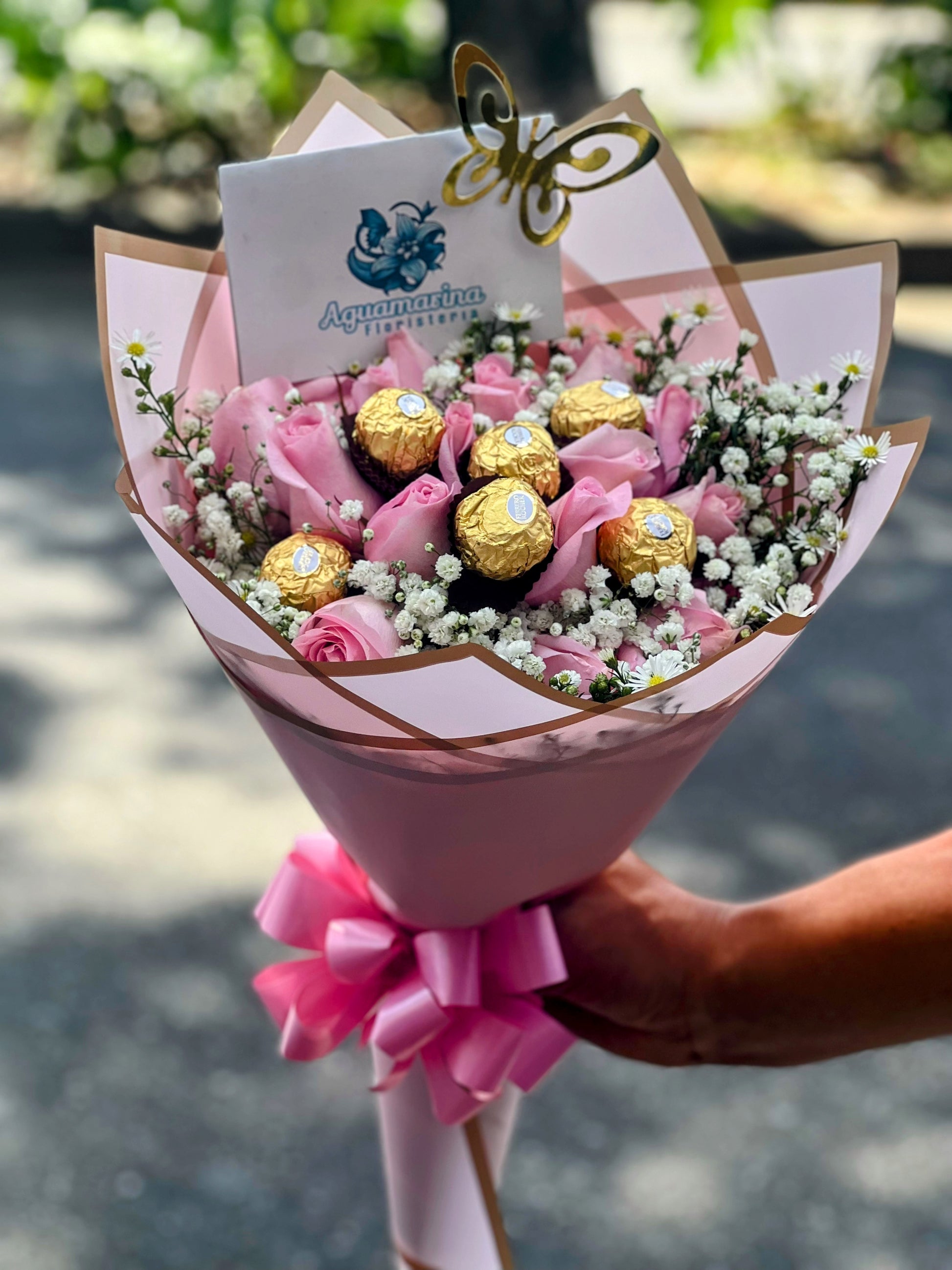 Este hermoso bouquet mezcla delicadas rosas rosadas con flores blancas y deliciosos bombones Ferrero Rocher, envueltos en un elegante papel rosado con lazo satinado.